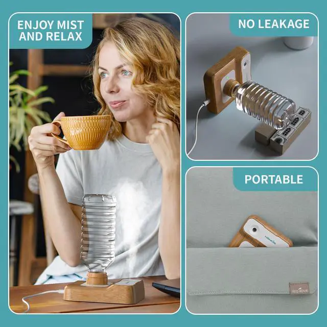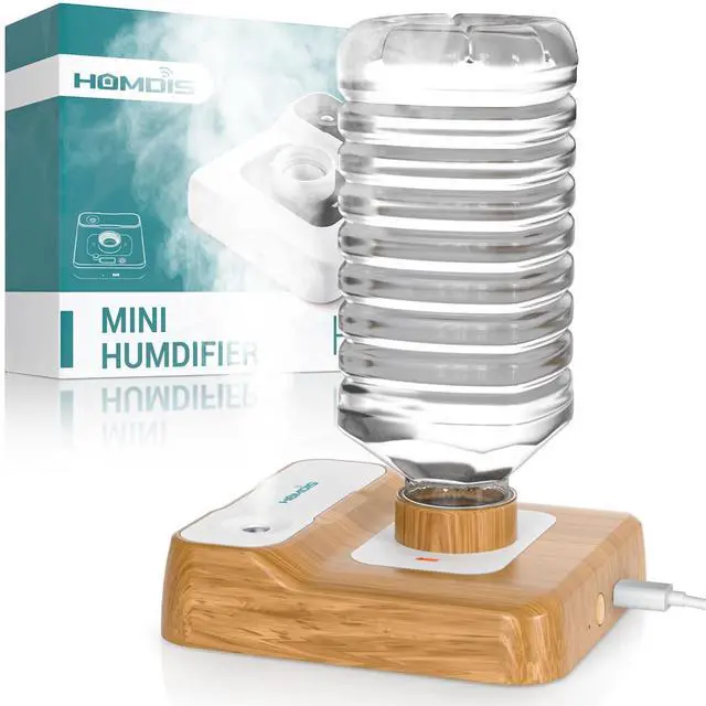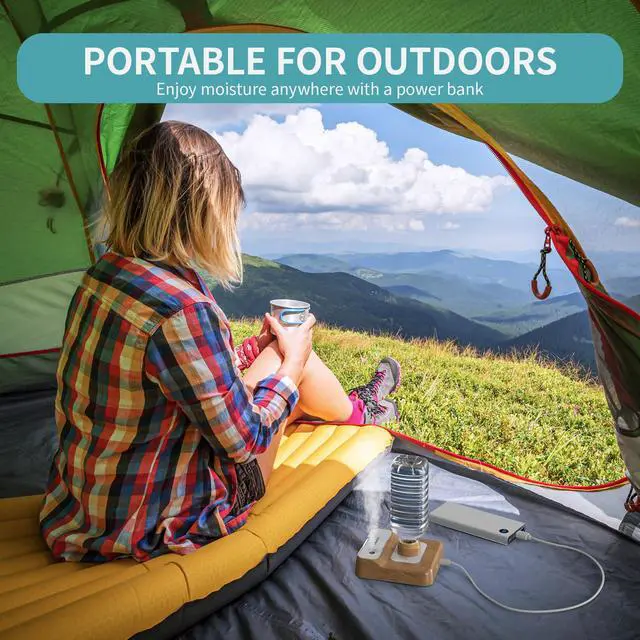LIGHTWEIGHT, SMALL & PORTABLE - With only 7 ounces light-weight and 5.91 inch wallet size body, this portable humidifier is super easy for you to carry with during camping, travel or business trip; just simply add a bottle of water and you can start enjoy the mist of humidity wherever it is.