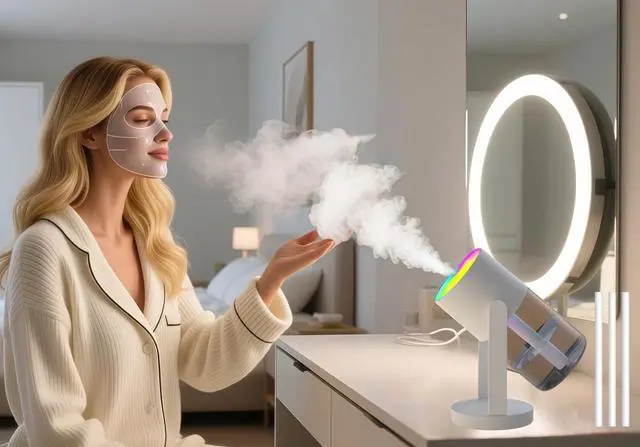 UEISODC humidifier A portable fine-mist humidifier with an LED night light and 360° rotationEquipped with an automatic shut-off safety function, it turns off automatically when the water level is lowProvide your home with a hydrated environment. The UEISODC humidifier maintains an ideal humidity level (40-60%) in your home, keeping your skin, throat, and nasal passages moisturized, supporting better breathing and all-day comfort, and relieving dry air such as tight skin, dry and itchy throat, cough, and nasal congestion