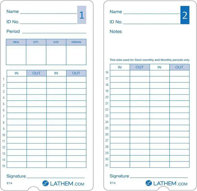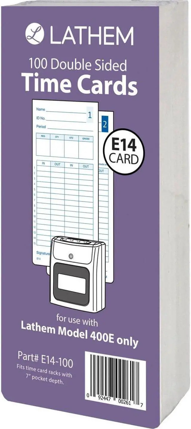 Double-sided time cards are designed especially for use with Lathem 400E Time Clock. One side works for daily clock ins while the other side is used for semi-monthly and monthly time periods only. Side 1 includes prompts for name, ID number, period description and signature as well as two in/out boxes for 15 rows and boxes for regular time total, overtime 1, overtime 2 and gross. Side 2 offers a 16 rows each with two in/out boxes and places for notes, name and ID number signature. Universal time card supports all pay periods. 7" height requires Lathem 25-7EX Time Card Rack (sold separately).