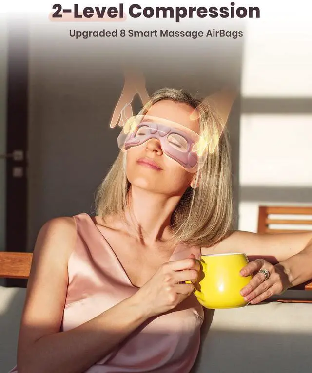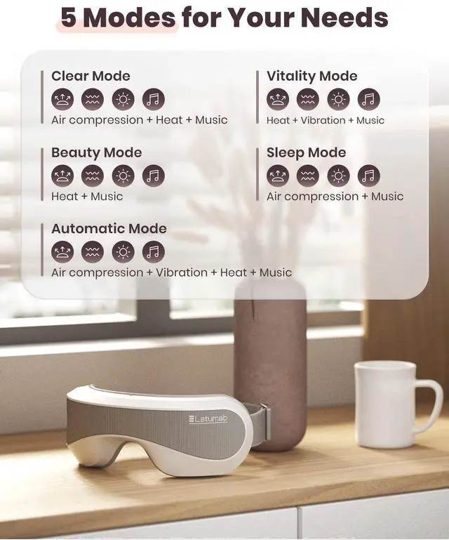 Latumab eye massager with heat uses gentle vibrations/compression and heat to help alleviate eye strain and fatigue caused by extended use of digital devices, reading, and driving.