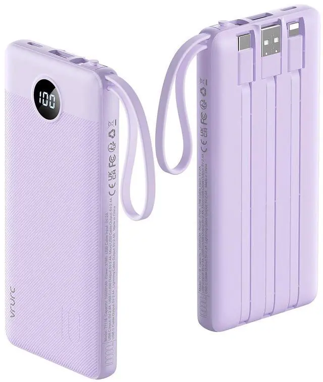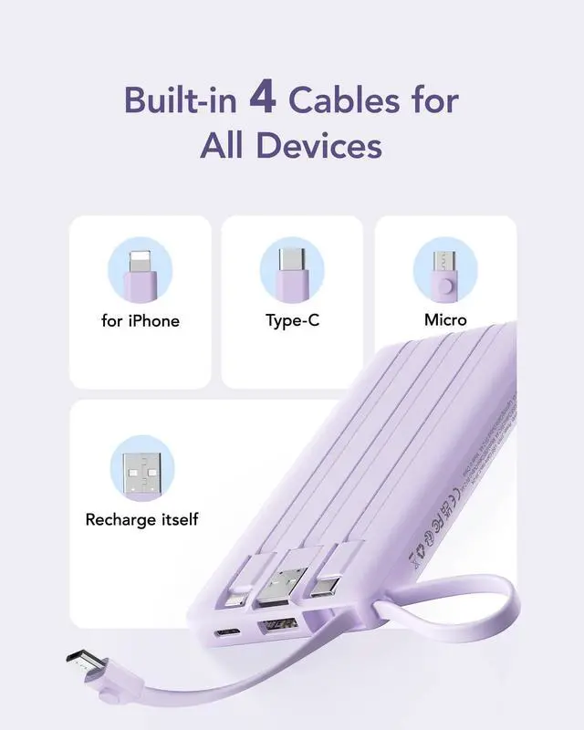 | Fetures | Built-in 4 cables, usb-c in & out port, Lanyard design,multi port power bank for most devices |