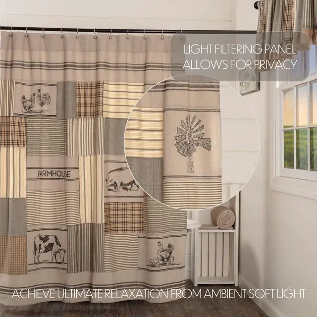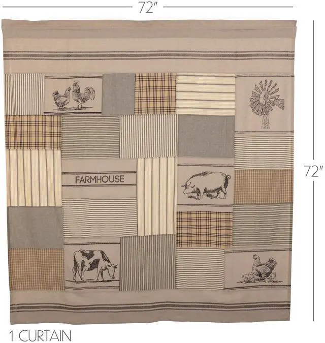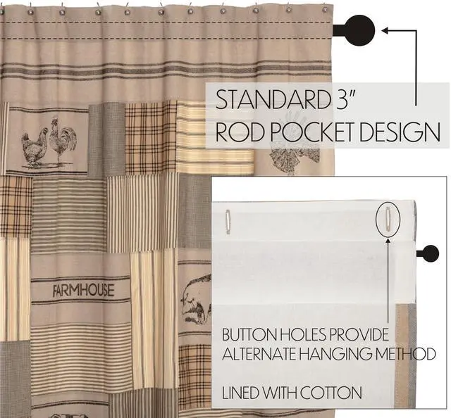 Khaki cotton and charcoal black patchwork and stenciling create a design to capture the essence of modern farmhouse decor. The Sawyer Mill Charcoal Stenciled Patchwork Shower Curtain features a patchwork of classic patterns including stripes and plaids. Interspersed khaki blocks include a stenciled farm designs. Measures 72 by 72 inches to fit standard sized showers and baths. Easily hang this classic country bath curtain with shower hooks of your choosing (not included) using the button holes attached. A 3 rod pocket is also available as an alternative hanging method.