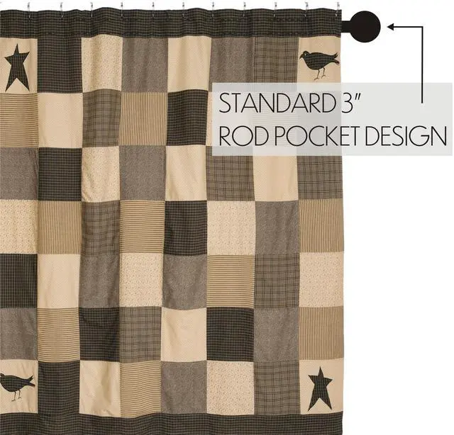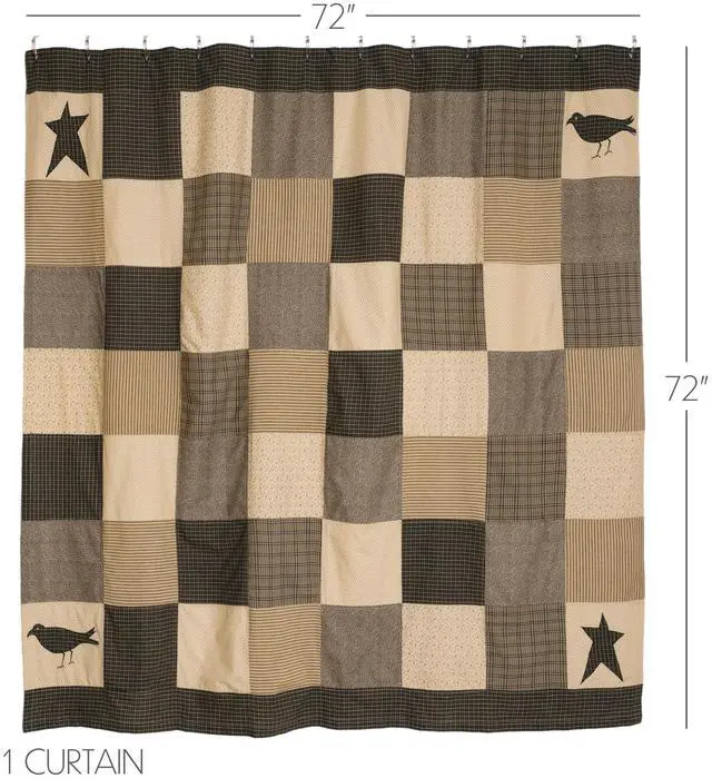 Decorate your bathroom with the perfect blend of simplicity and country charm with the Kettle Grove Shower Curtain. Featuring a black and creme patchwork with applique accents, our 72x72 fabric shower curtain provides a modern primitive touch to your bathroom decor. This machine washable, 100% cotton shower curtain includes button holes for shower hooks and a rod pocket for versatility and convenience.