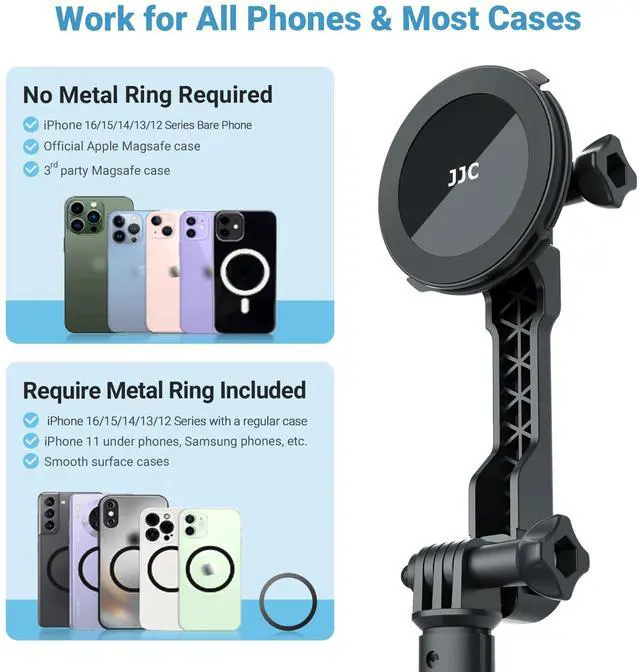 | Specifications | Metal, Plastic, iPhone 15 Pro Max, iPhone 15 Pro, iPhone 15 Plus, iPhone 15, iPhone 14 Pro Max, iPhone 14 Pro, iPhone 14 Plus, iPhone 14, iPhone 13 Pro Max, iPhone 13 Pro, iPhone 13 Plus, iPhone 13, iPhone 12 Pro Max, iPhone 12 Pro, iPhone 12, Tabletop, Magnetic Desk Stand x1, Wireless Remote Control x1, 1/4''-20 Screw Base x1, Magsafe Ring x2, CR2025 Battery x1, Hexagon Wrench x1, Clear Protective Film x2, Wet Cleaning Wipe x2, Instruction Manual x1, MSS-1, JJC, true, One year warranty from the date of purchase |