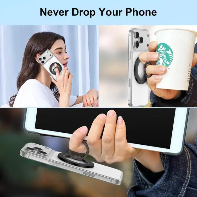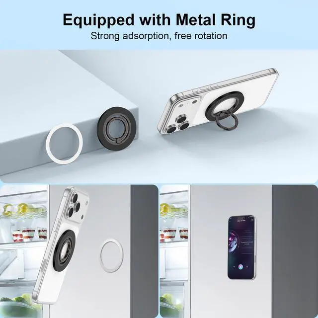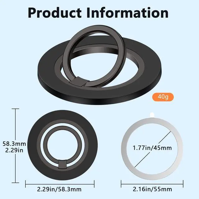 The magsafe phone ring holder, which is composed of super strong magnets, can support the weight of five iPhones. You can hook your phone with one finger and the magsafe phone grip will hold it very tightly.