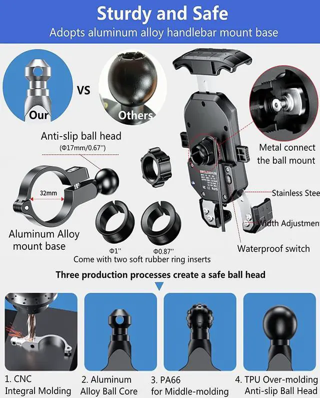 1. The Motorcycle phone holder with one-push lock and quick release switch.