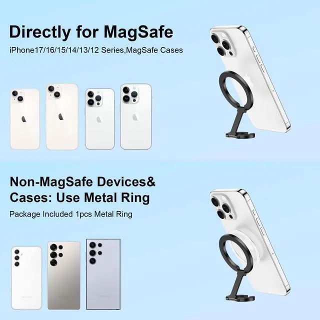 This MagSafe ring holder works seamlessly with MagSafe devices. For non-magnetic phones, it includes a metal ring to attach to any case, ensuring universal compatibility and secure grip.