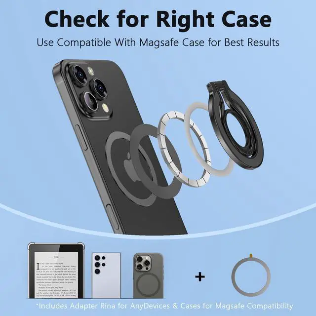 Compatible with all magsafe devices and non-magnetic phones with included metal rings, supporting iPhone, Samsung Galaxy, Google Pixel, and more