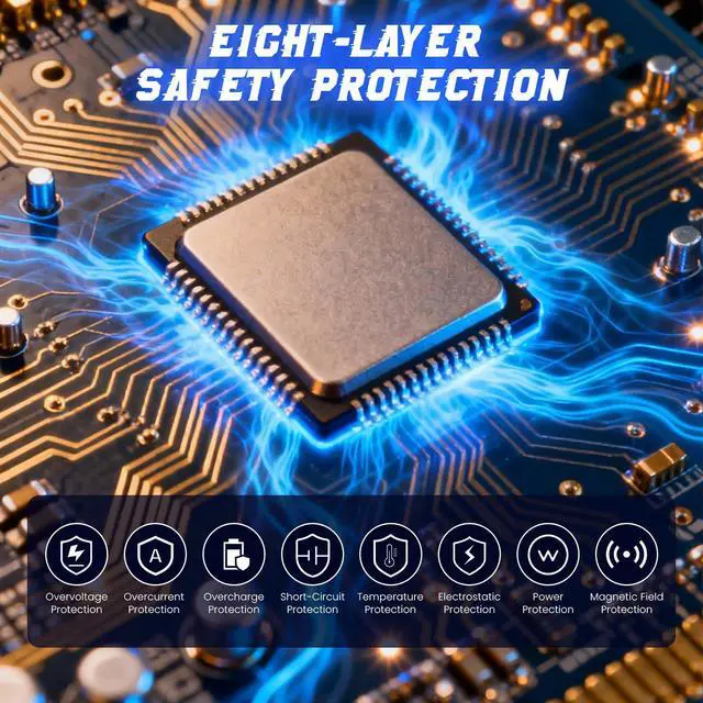Eight-Layer Safety Protection:Features overvoltage, overcurrent, overcharge, short-circuit, temperature, electrostatic, power, and magnetic-field protection for safe charging at all times