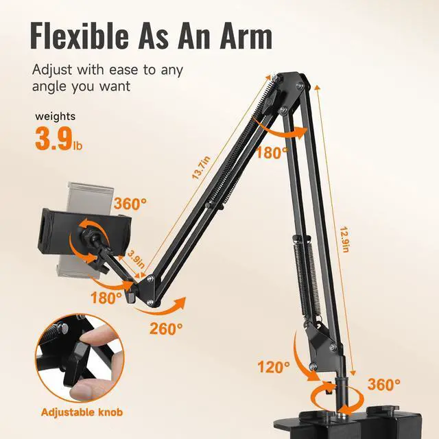 7.8 L x 3.1 W x 13.7 H inches, 3.24 pounds, Flexible, Slot-Insert Base, Phones and Tablets (5-12.9 inches), Tablet Mount, Adjustable Arm, Metal Base, Connector, Fixed Nut, Bolt, A-107, SEANCHEER, false, 2 Year Manufacturer
