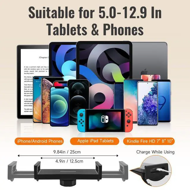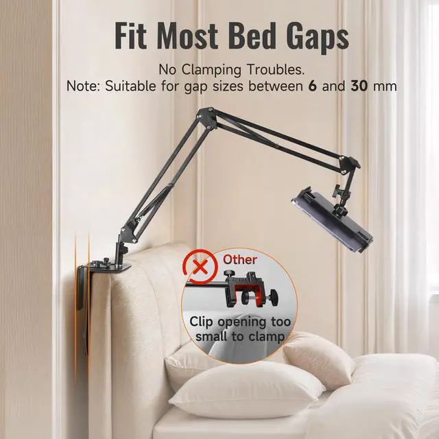 Perfect Bedside Viewing CompanionThis tablet stand holder is made specifically for your bedsideno floor space required, no clamps needed, simply insert it into the gap between the headboard and the wall. Our gap-mount design works where others cant.It keeps your phone or tablet securely at eye level whether youre lying down, sitting up, or watching videos, with no neck strain and no risk of your device falling. If you want something stable, simple, and truly bedside-friendlythis is it.
