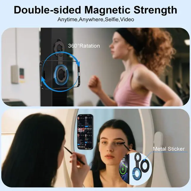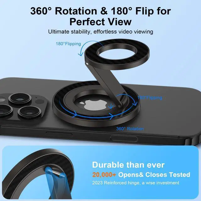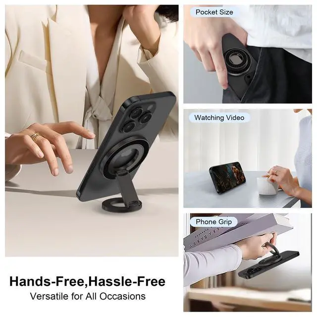 Enjoy stable, free viewing in landscape or portrait mode with the adjustable stand and full 360° magnet ring..