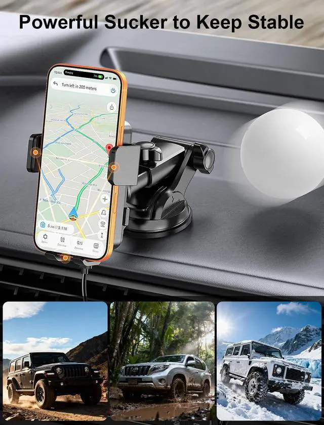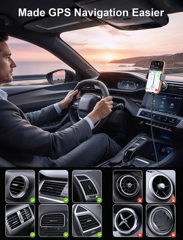 Multiple Mounting OptionsThe phone holders for your car has multiple mounting methods to stick to windshield, dashboard, air vent, or even the flattest surfaces and makes GPS navigation and calling easier than ever. This cell phone holder car charger is applied to most cars, pickup trucks, SUVs, taxis. A perfect assistant for Uber, Lyft drivers.