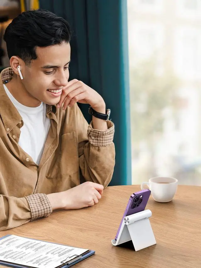 The cell phone stand for desk can fold flat for travel or storage, with compact size to carry in a backpack or bag.
