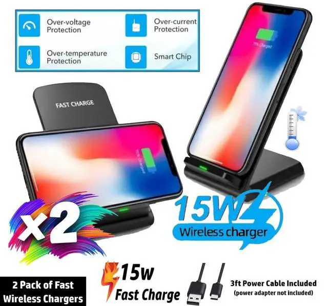 This 2 Pack Wireless Fast Charger Stand Pad for Apple iPhone 17 16 15 14 13 12 11 XR XS is a sleek and convenient charging solution for Apple and Samsung devices. This charger features a dual-layer design with a matte finish, with a voltage of 9V and a cable length of 3ft, this charger offers fast charging capabilities of 15w power output. The charger also comes with a grip mount bottom for easy placement on a vanity, table, desk, or nightstand, making it a practical and stylish addition to your workspace or home.
