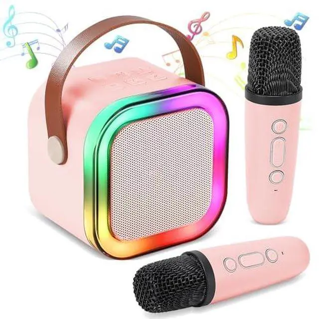 Mini Karaoke Machine for Kids, Portable Bluetooth Speaker with 2 Wireless Microphones, Christmas and Birthday Gifts Suitable for Girls Aged 4 to 12 (Pink)