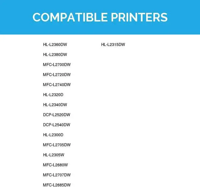 MFC Printers: L2520DW, L2540DW, L2300D, L2320D, L2340DW, L2360DW, L2380DW, L2700DW, L2705DW, L2707DW, L2720DW, and L2740DW. Please note, retail packaging may vary, and this item will only work with printers purchased within the United States and Canada. Brother does not manufacture our compatible toner cartridges. Brother is a registered trademark of Brother Industries, Ltd. and is not affiliated with and does not endorse LD Products. We are the exclusive reseller of LD Products brand of high quality printing supplies.