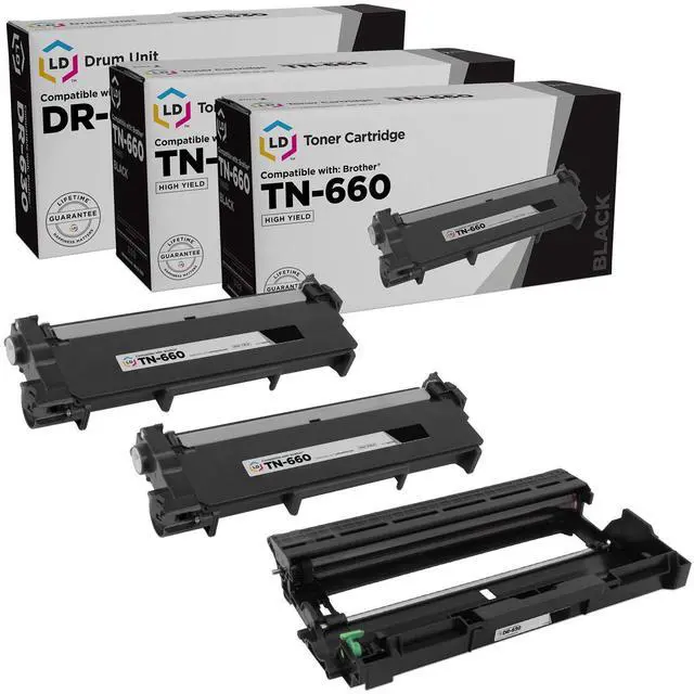 This set includes 2 TN660 High Yield Black Toner Cartridges and 1 DR630 Drum Unit. This set works in the following Brother DCP, HL, and