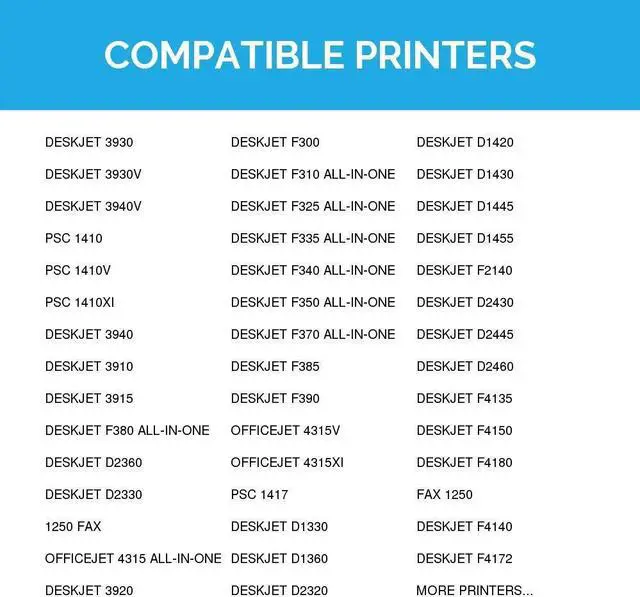 Deskjet printers: D1468, D1520, J3635, J3625, FAX 1250, F2210, 4315, F2120, F4140, F2110, F375, D1420, F335, D1560, D1530, F4135, F300, PSC 1410, PSC 1401, D2430, D1430, 4315v, F340, F2240, D1341, D1320, F2180, F4185, F4180, D2460, D2445, F2140, D1455, D1360, F370, D2330, 3915, 3940, PSC 1410v, 3930, D1460, D1415, F2290, F2280, F2275, F2235, J3640, J3608, D1311, D1568, D2345, F2188, F2187, F2128, F4172, FAX 1250, F4150, D1445, D2320, D1330, 4315xi, F390, F385, F350. We are the exclusive reseller of LD Products brand of high quality printing supplies on Newegg.