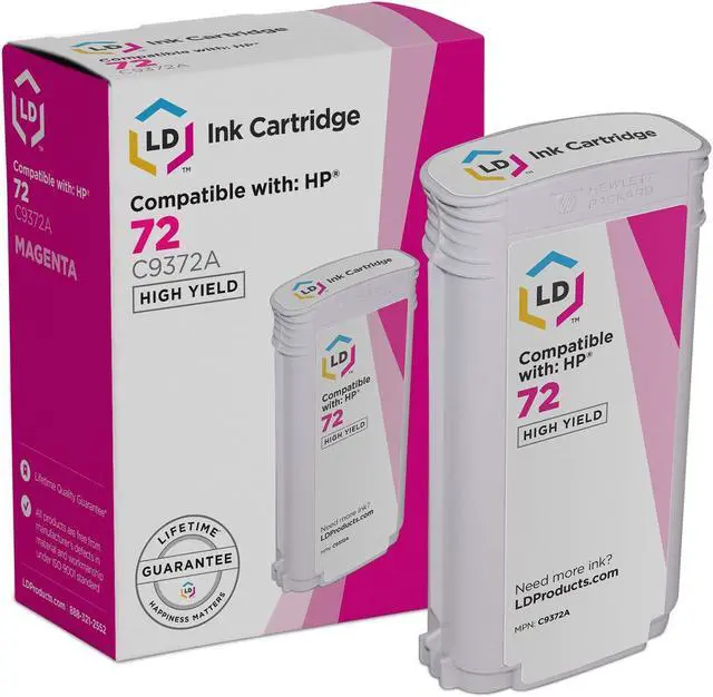 Save and print even more when you shop LD Products! This product includes a LD Products Compatible Replacement for HP 72 Ink Cartridge C9372A High Yield (Magenta, Single-Pack) For use in printers DesignJet T1100, T1120, T1200, T610, T620, T770, SD Pro MFP, T1100ps, T1120 SD-MFP, T1120ps. Why pay more for a branded name when our compatible printer supplies deliver excellent quality results for a fraction of the price? Our printer supplies are good for home, office or when you're running a business. Our products are put through a rigorous testing process where they are monitored for quality and reliability.