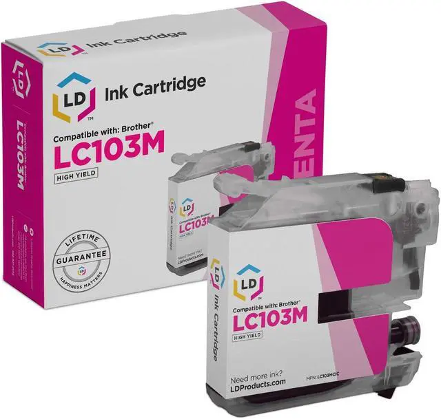 Our compatible LC103M high yield magenta inkjet cartridges for your Brother printer is manufactured to meet the same specifications and performance standards as the Brother LC103M ink-jet cartridges. Get the same quality printouts as your genuine Brother LC103M ink jet cartridges. Why pay more for a LC103M brand name ink cartridge? Save compared to MSRP on all the LC-103 series inkjet cartridges for your Brother printer. These cartridges are conveniently equipped with a smart chip that allows you to monitor and track your ink levels.