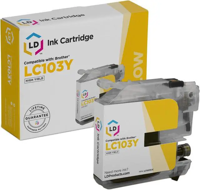 Our compatible LC103Y high yield yellow inkjet cartridges for your Brother printer is manufactured to meet the same specifications and performance standards as the Brother LC103Y ink-jet cartridges. Get the same quality printouts as your genuine Brother LC103Y ink jet cartridges. Why pay more for a LC103Y brand name ink cartridge? Save up to 79% compared to MSRP on all the LC-103 series inkjet cartridges for your Brother printer. These cartridges are conveniently equipped with a smart chip that allows you to monitor and track your ink levels.
