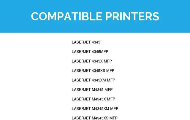 HP LaserJet Printers: 4345, 4345mfp, 4345x mfp, 4345xm MFP, 4345xs MFP, M4345 MFP, M4345x MFP, M4345xm MFP, M4345xs MFP. Please note, retail packaging may vary and this item will only work with printers purchased within the United States and Canada. We are the exclusive reseller of LD Products brand of high quality printing supplies.