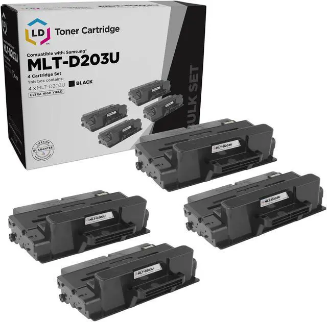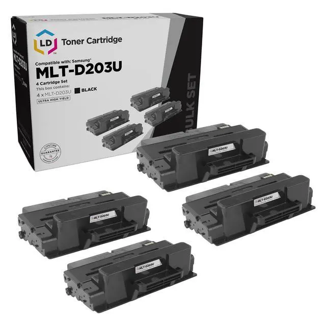 Save even more with our set of 4 compatible laser toner cartridges. This set includes 4 MLT-D203U ultra high yield black laser toner cartridges. Why pay twice as much for brand name Samsung MLT-D203U cartridge when our compatible printer supplies deliver excellent quality results for a fraction of the price? Our compatible cartridges for Samsung are backed by a full 2 year 100% satisfaction guarantee. So stock up now and save even more! This set works in the following Samsung SL printers: SL- M4020ND, and SL-M4070FR. We are the exclusive reseller of LD Products brand of high quality printing supplies on Amazon.