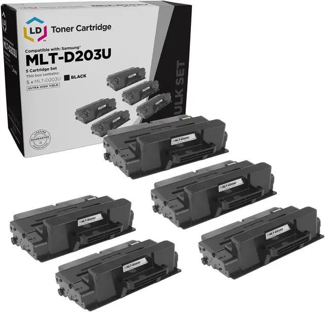 This set includes replacements compatible with 5 MLT-D203U ultra high yield black laser toner cartridges. This set works in the following