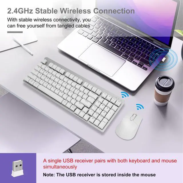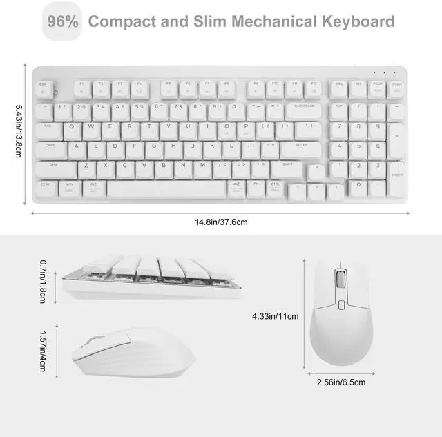 - Compact and Sleek Design: LeadsaiL FA98 wireless mechanical keyboard and mouse combo features a compact design, saving desktop space and making it convenient to carry. With a slim profile and sturdy construction, our keyboard is built to last. The matte finish and minimalist design make it a stylish addition to any workspace.