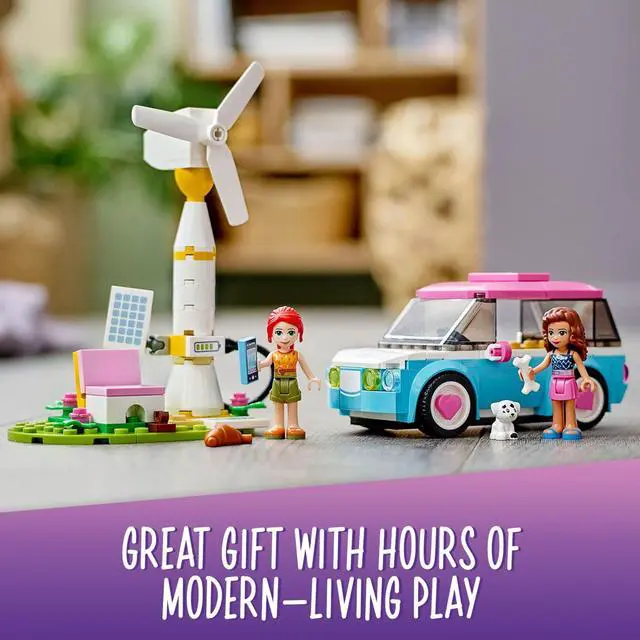 Kids who love caring for the planet will love LEGO Friends Olivias Electric car toy for kids 6+ years old (41443). This set lets children who love toy vehicles and care for the planet embark on hours of open-road adventure. The colorful electric car toy for kids 6+ years old fits 2 mini dolls and theres space on the rear seat for puppy Elliot. The set includes a charging station that continues the green theme with its toy wind turbine and solar panel. Kids can then exit their pit stop leaving zero emissions in the air! Let them enjoy road-trip role play as they imagine driving to the countryside. LEGO Friends toys with colorful buildings, toy vehicles, and relatable characters make a meaningful birthday present or Christmas gift idea! Kids can combine this toy vehicle with any other LEGO bricks they have at home, helping their imaginations really take flight. The car measures over 2 in. (6 cm) high and 4 in. (11 cm) long. The wind turbine stands over 5 in. (13 cm) high, 3 in. (9 cm) wide and 2 in. (6 cm) deep. Contains 183 pieces.