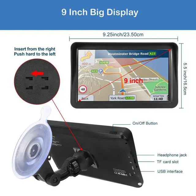 [9 Inchs Touch Screen] GPS navigation for car truck comes with 9 inchs large touchscreen to help you keep a clear view of everything, which providing a better visual experience for safer driving. Bright, easy to read and responsive to touch input.Thanks to the free suction cup and the glued holder can the GPS navigator for car be mounted not only on the windshield but also on the dashboard.