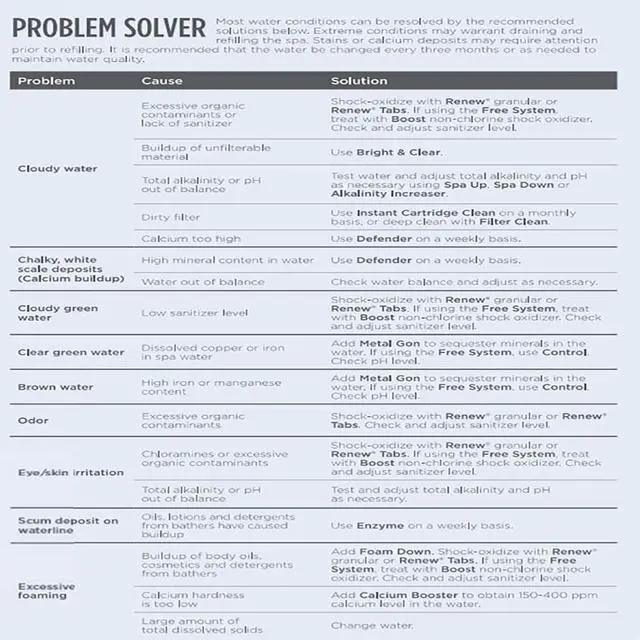- Spa compatibility: Bromine, chlorine, salt water, ozone, minerals, biguanide