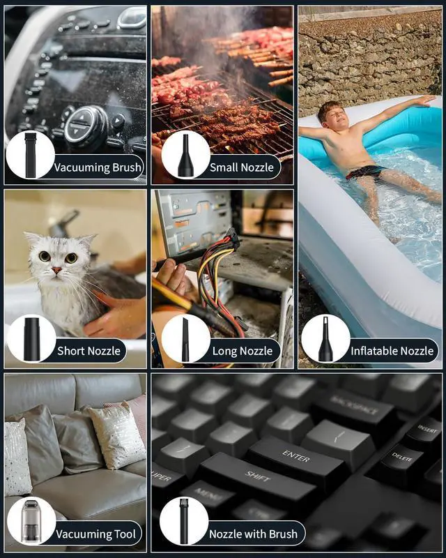 The nozzle of this electric air duster can be replaced and the brush and vacuum cup can also be cleaned making it easier to clean corners or places that cannot be reached by hand and more convenient. About useThis compressed air duster is simple and convenient press and hold the button for 3 seconds to turn it on and the light will automatically light up (double-click the button to turn off/on). Short press the switch to easily switch between three different wind speeds to meet different needs. The electric air duster has a circuit protection design.