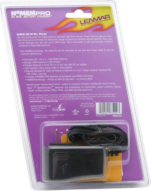 | Specifications | 2-Hour charger for AA / AAA NiMH batteries, Charges 2 or 4 cells at a time Includes four 2300mAh AA batteries, International AC Adapter 100-240VAC, 50-60 Hz, DC car cord for use on the road Chemistry: NiCd or NiMH Dimensions: 4.25" x 2.54" x 1.1" (LxWxH) |