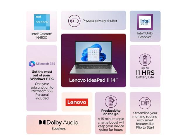 Lenovo IdeaPad 1 1i 14" Laptop with 1-year Microsoft 365, Intel Processor, 4GB RAM, 128GB eMMC + 128GB SSD, SD Card Reader, Privacy Camera, 11 hrs Long Battery Life, with Accessories, Win 11 Home