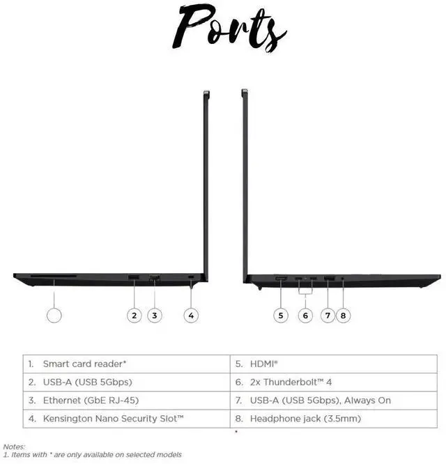 | Ports | 2x USB-C (Thunderbolt 4, with PD 3.0 & DP 1.4) , 2x USB-A (1 always on), 1x Ethernet (RJ45), 1x HDMI 2.1 (supports resolution up to 4K@60Hz), 1x Headphone / mic combo, 1x Security keyhole |