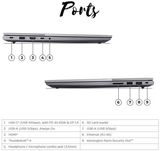 | Ports & Slots | 2x USB-A USB 3.2 Gen 1(1 Always On), 1x USB-C (USB 3.2 Gen 2 with USB PD & DP 1.4), 1x USB-C (Thunderbolt 4 / USB PD & DP 2.1), 1x HDMI 2.1, 1x Headphone / microphone combo jack (3.5mm), 1x Ethernet (RJ-45), 1x SD card reader |