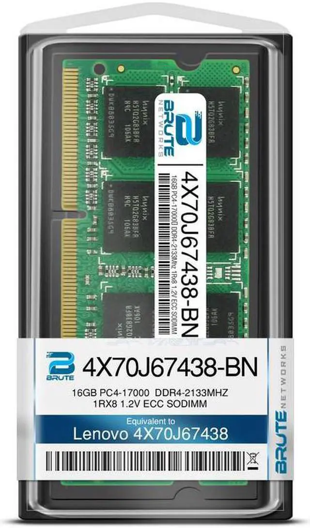4X70J67438-BN is a Lenovo compatible 16GB PC4-17000 DDR4-2133Mhz 2Rx8 1.2v ECC SODIMM, equivalent to Lenovo labeled PN#: 4X70J67438. Brute Networks modules are all major brand (Samsung, SK Hynix, or Micron). This module is guaranteed compatible with your server, as well as guaranteed to maintain your factory warranty, since Brute Networks modules are from the same manufacturers Lenovo uses for their OEM branded modules.