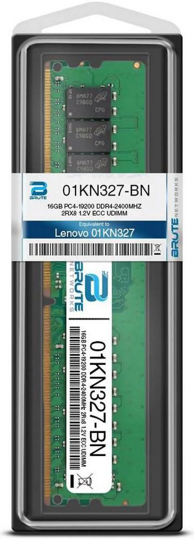 Lenovo Compatible 01KN327 - 16GB PC4-19200 DDR4-2400MHz 2Rx8 1.2V ECC UDIMM 01KN327-BN is a Lenovo compatible 16GB PC4-19200 DDR4-2400MHz 2Rx8 1.2V ECC UDIMM, equivalent to Lenovo labeled PN#: 01KN327. Brute Networks modules are all major brand (Samsung, SK Hynix, or Micron). This module is guaranteed compatible with your computer, as well as guaranteed to maintain your factory warranty, since Brute Networks modules are from the same manufacturers Lenovo uses for their OEM branded modules.