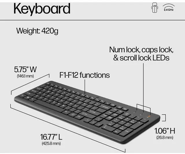 Pick up and go with the JAYSUING 330 Wireless Keyboard and Mouse Combo--the perfect wireless companions for wherever your journey takes you. Experience quieter, more comfortable computing without the distracting noise of mouse clicks and keystrokes with this ergonomic chiclet keyboard with numeric keypad and computer mouse. Reduce workspace clutter and say goodbye to tangled cords as you enjoy untethered 2.4GHz wireless connectivity (1) for both devices using a single USB receiver compatible with USB-A enabled laptop PCs and desktop computers. Work smarter and with fewer keystrokes thanks to convenient F1-F12 keyboard shortcuts that activate frequently used functions with just a keypress, while easy-to-see LED indicators illuminate the Num Lock, Caps Lock, and Scroll Lock keys so you can see what's on or off at a glance. Designed for all-day comfort, the wireless ergonomic mouse features multi-surface 1600 dpi optical sensor technology for smooth mouse tracking on virtually any surface (1), plus the 1600 dpi optical sensor gives you precise, accurate control of every click and selection for greater speed and efficiency. And thanks to its energy-efficient design, the JAYSUING 330 Wireless Keyboard and Mouse Combo keeps you productive all-day without interruption with 20+ months of battery life for the keyboard and 24+ months for the mouse using just 2 AAA batteries (2). (1) Does not track on glass. (2) Utilizes 2 AAA Batteries. Battery life based on 5 days week, 8 hours per day. Actual battery life will vary with use and environmental conditions and will naturally decrease with time and usage.