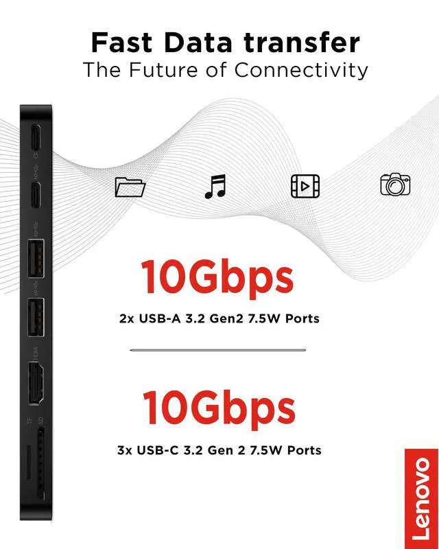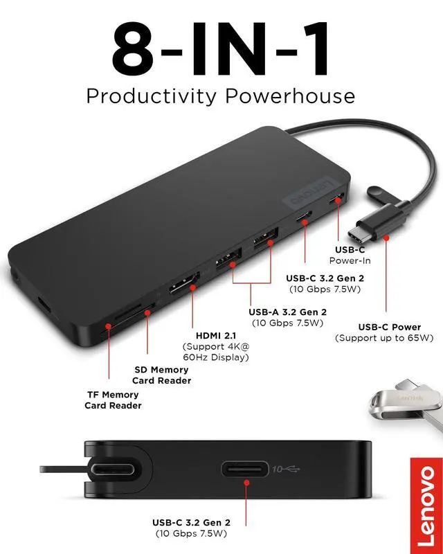 Stay ahead of the curve in todays fast-paced digital world with the power-packed Lenovo USB-C Slim Travel Dock. With 8 strategically positioned ports, youll enjoy a surge of productivity wherever you are. It also efficiently drives a 4K display, provides up to 65W PD to USB-C laptops*, and champions sustainability with 66% recycled content in the exterior.