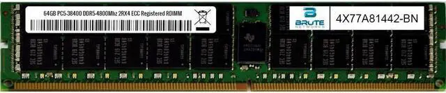 Brute Networks 4X77A81442-BN is an OEM compatible 64GB PC5-38400 DDR5-4800Mhz 2Rx4 ECC registered RDIMM, equivalent to Lenovo labeled PN#: 4X77A81442
