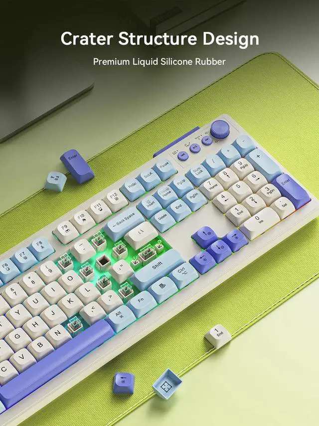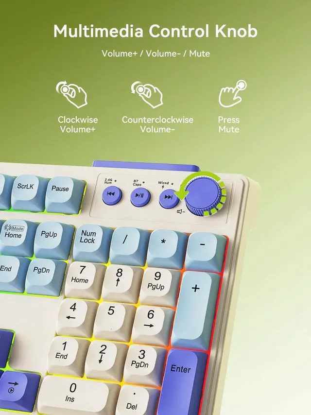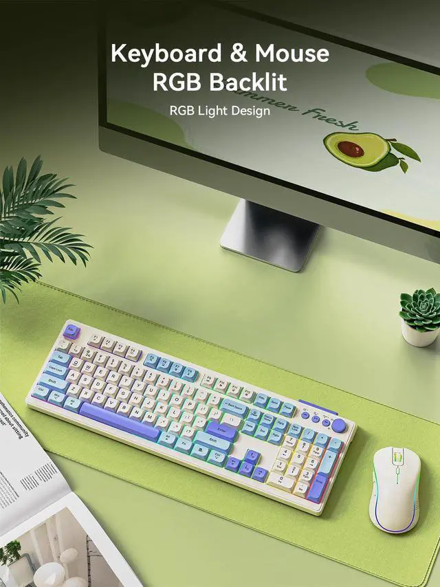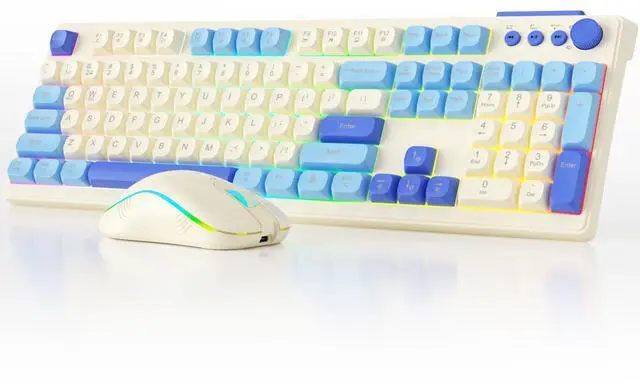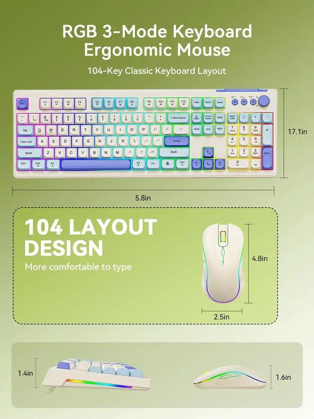 Full Size Keyboard, Plug and Play with It104 Keys Full Size Keyboard. Featuring standard keyboard layout with F-keys ( function keys ) and number pad. Floating keycaps are removable and feel good in the hand. keyboard and mouse combo with RGB backlighting. It features 2.4G mode, Bluetooth, and wired mode functionality.