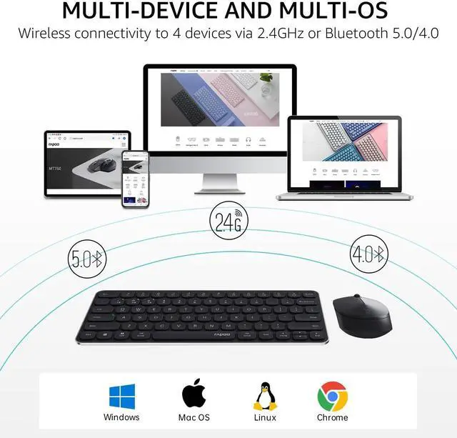 Just turn the mode button (BT/OFF/2.4G) according to your needs - you can find the mode button on the back side of the keyboard, and bottom of the mouse. The Bluetooth 5.0/4.0 is automatically detected and applied according to your device version.
