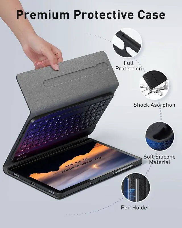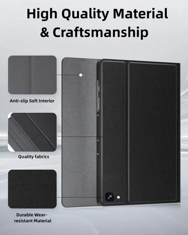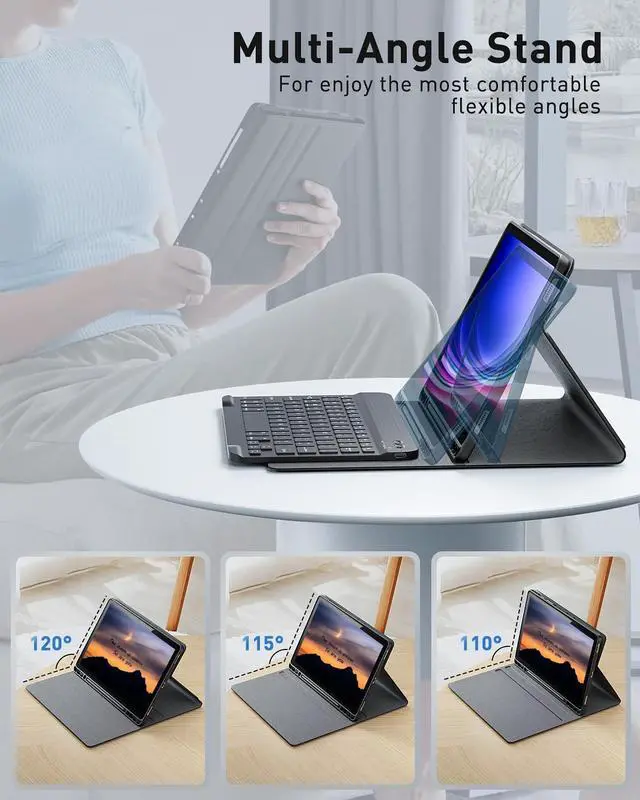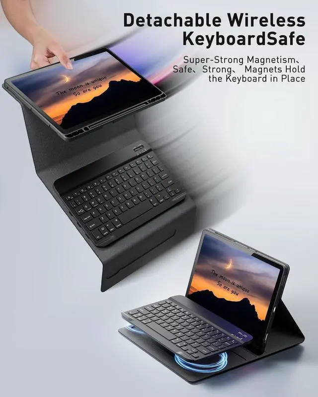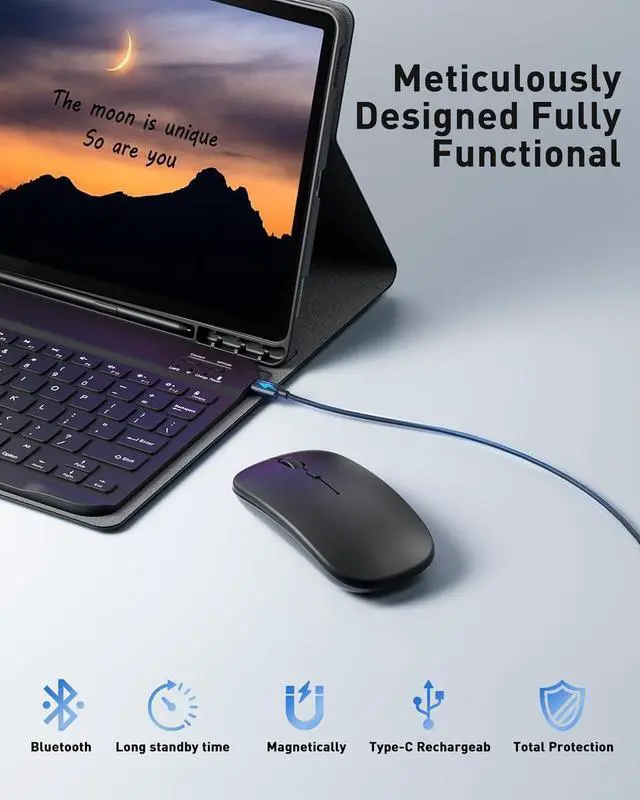 Mouse and magnetic detachable keyboardThe case comes with a rechargeable Bluetooth mouse and a magnetic detachable Bluetooth charging keyboard. This ultra-thin and lightweight magnetic keyboard firmly attaches to the case, helps the tablet stand upright, and turns it into a mini laptop in less than a second. You can move and adjust the position of the keyboard at any time according to your preference