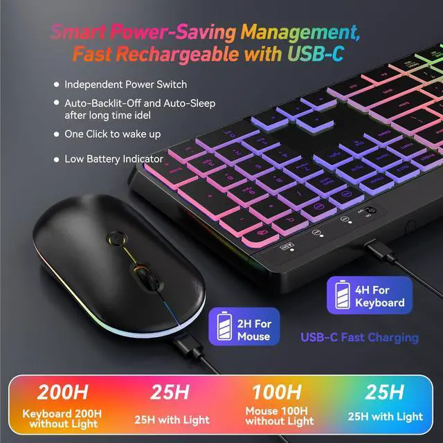 Get EarlyLit Wireless Colorful Rainbow Backlit Keyboard and Mouse Combo, Enjoy Ergonomic/Comfortable Keyboard and Slim/Portable Mouse Easily.