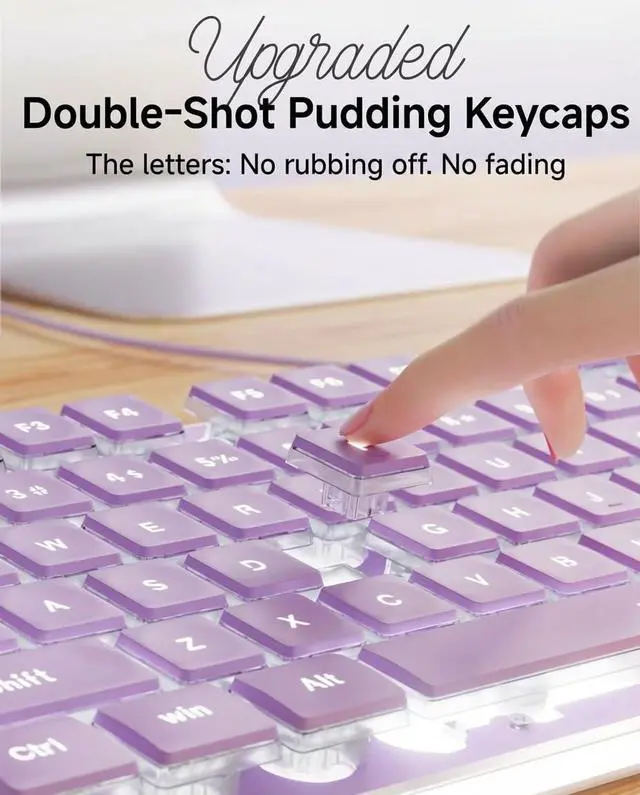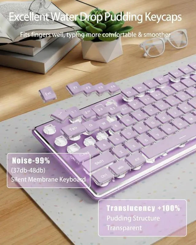 Upgraded Water Drop Pudding Keycaps & Less Noise: The quite computer keyboard uses an upgraded version of the suspended water drop keycaps. The suspension design + pudding structure design makes the silent keyboard more transparent. When the light is on, it looks like an elf. The surface of the keycaps is concave and convex, which is very suitable for your fingertips, making typing or gaming more comfortable and easier. It is also quieter, reducing typing noise by 95%. With wired keyboard, you no longer have to worry about noise interference from libraries, cafes, offices or dormitories