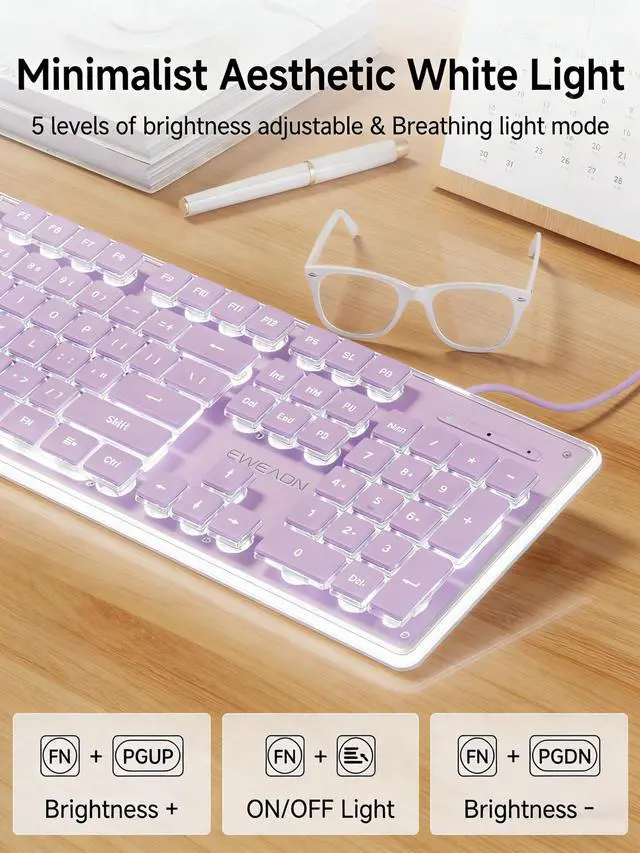 Simple White Backlight: GX710S Backlit Computer Keyboard uses a simple white backlight, the light is simple and more atmospheric. With the suspended water drop pudding keycaps, wired USB keyboard's light transmittance is greatly enhanced, and you don't have to worry about not being able to see the characters clearly. The light can be adjusted to 5 levels of brightness (FN+PU/PD can be adjusted) Note: It's a wired keyboard