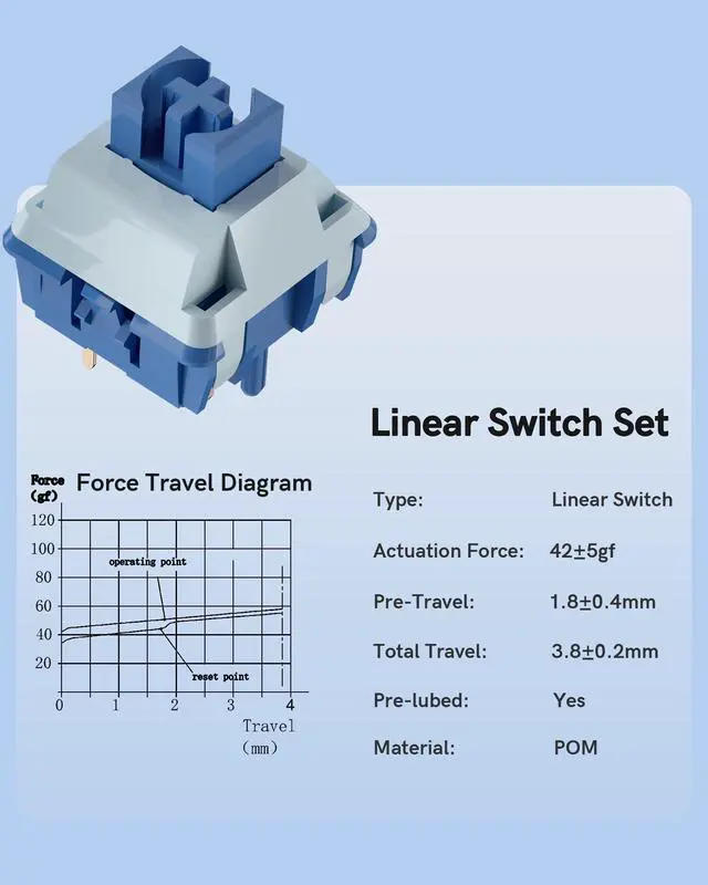 • 55gf Linear Actuation for Rapid Response As 55gf linear switches, they offer a smooth, bump-free actuation that is perfect for fast-paced gaming. The linear design allows for quick key presses, making them ideal for competitive gamers who need rapid response times.